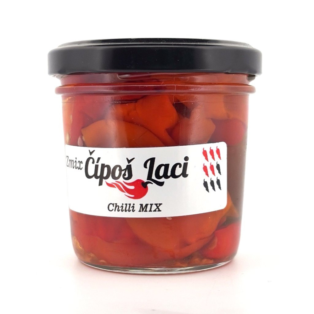 Zmes stredne pálivých chilli papričiek 300 000 - 499 999 SHU zaváraná v sladko-kyslom náleve. Plnený zmesou zo 60 druhov chilli papričiek.