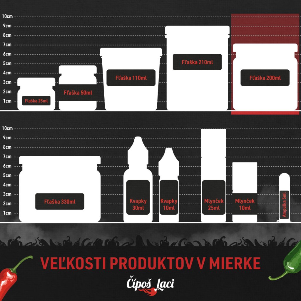 Zmes stredne pálivých chilli papričiek od cca 300 000 - 499 999 shu zaváraná v sladko-kyslom náleve. Plnený zmesou zo 60 druhov chilli papričiek .